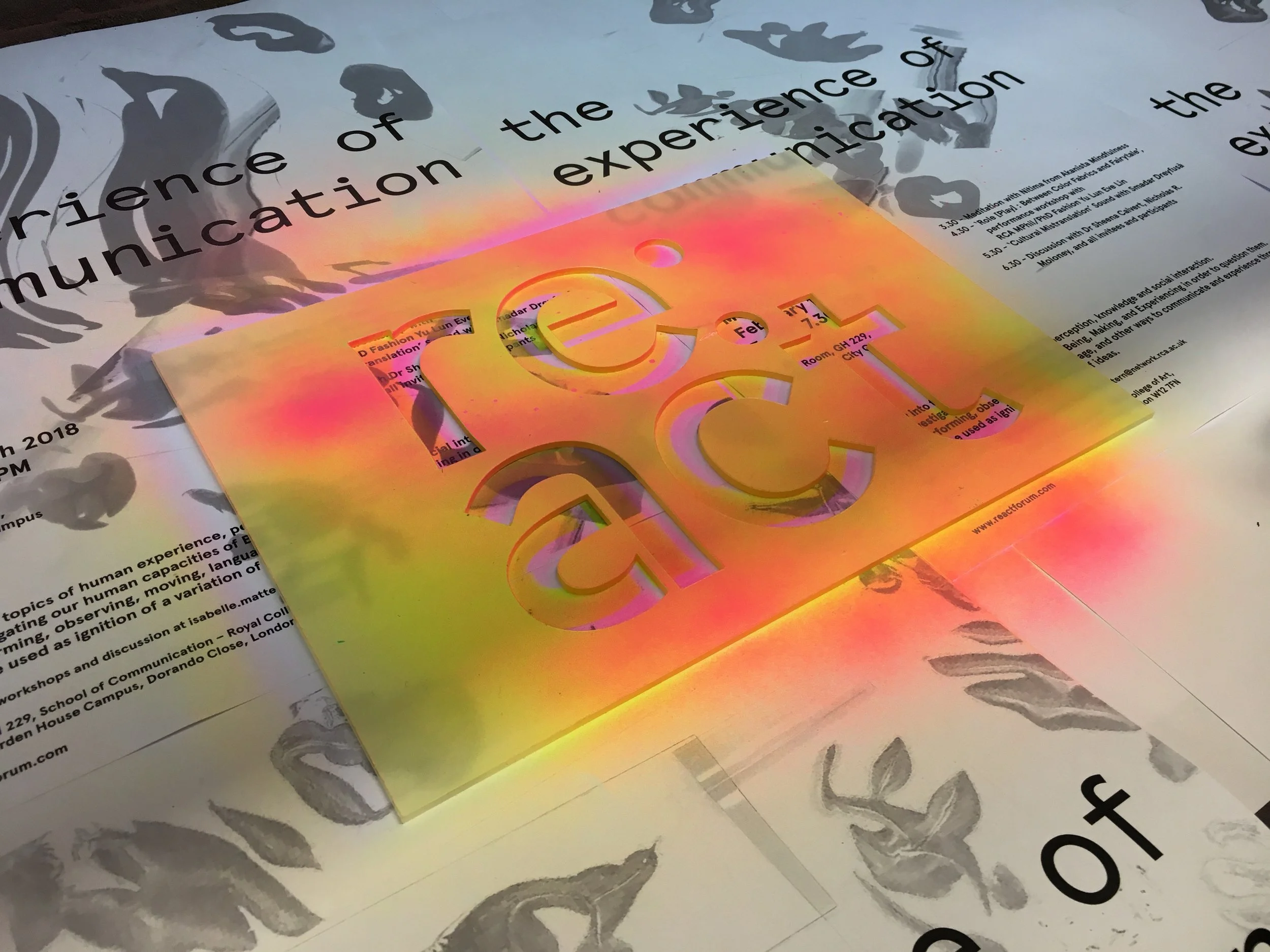 re:act RCA student forum identityco-designed with Jo Sordini and Linh Pham for the Re:Act student forum 2018 at Royal College of Art, London.