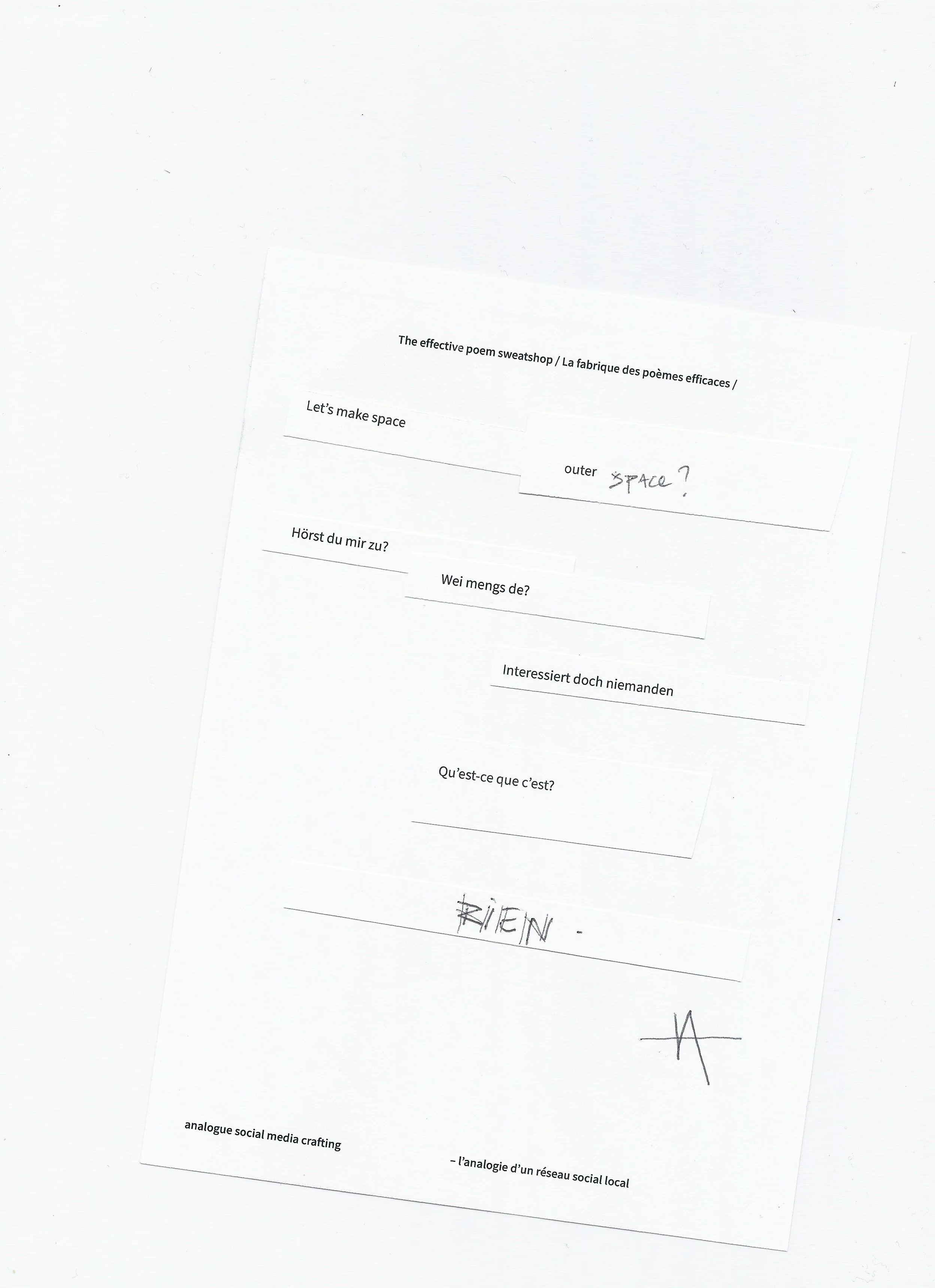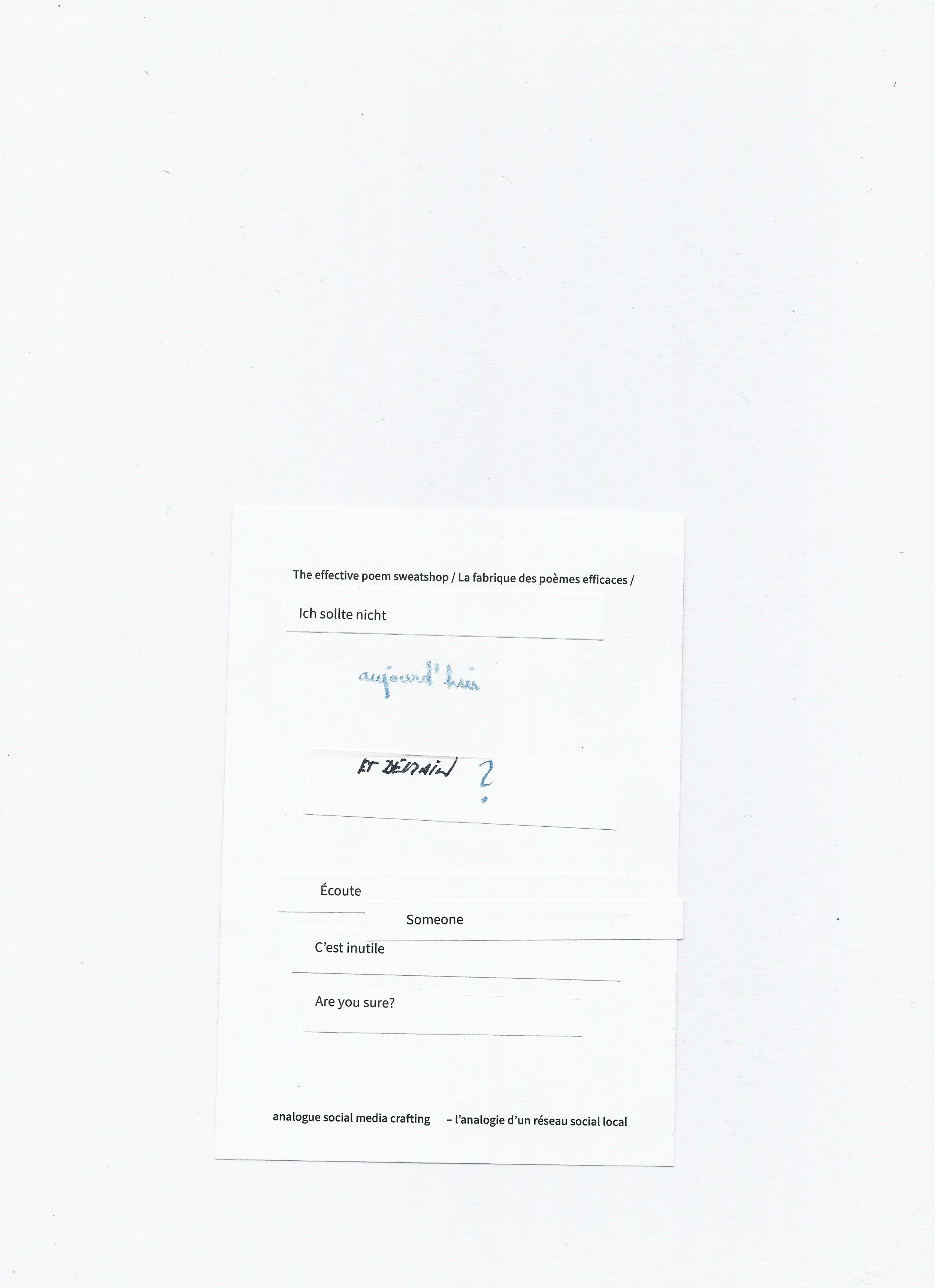 Interactive participatory writing workshop and co-writing process during Triennnale Jeune Création 2017 at Rotondes, Luxembourg